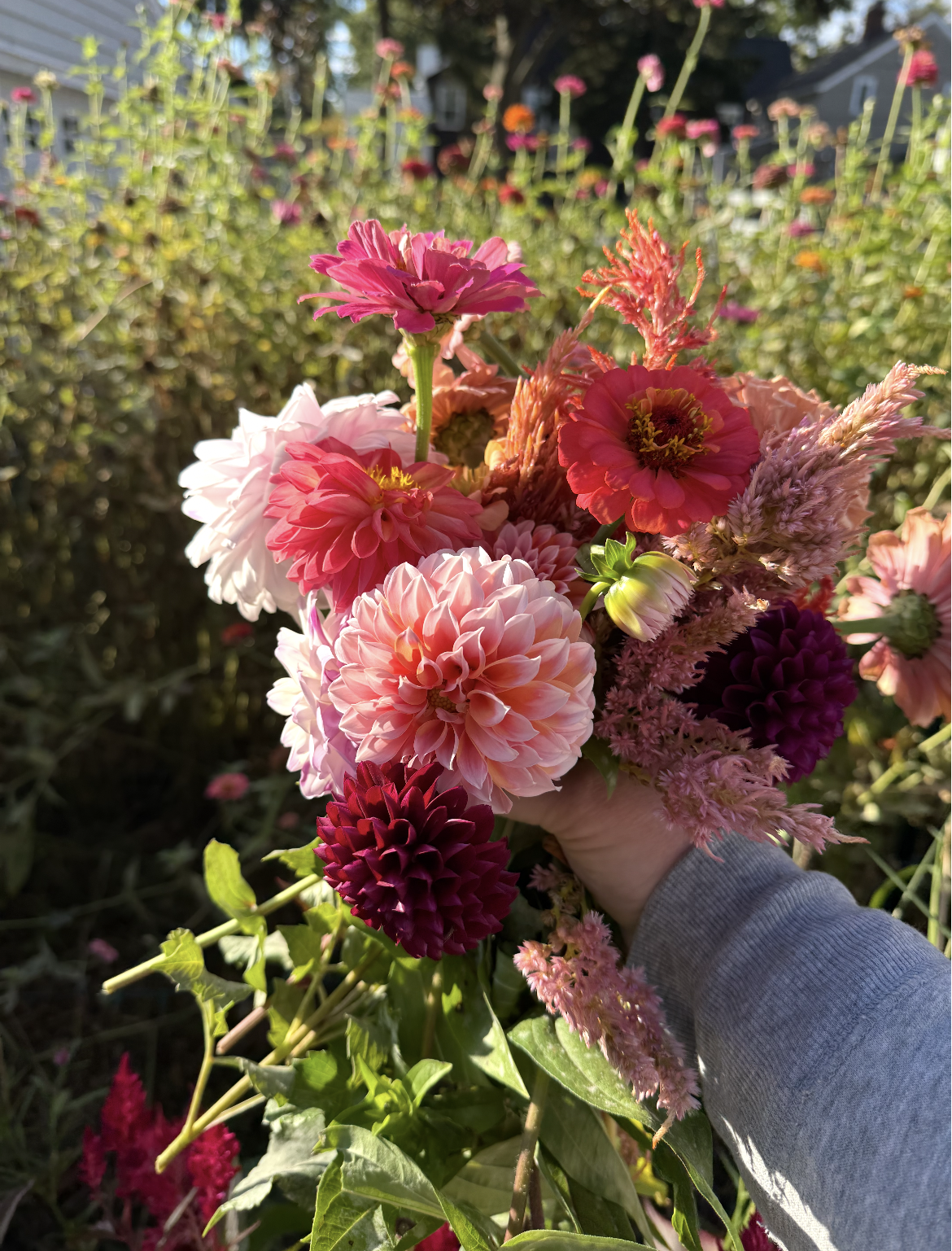 Summer into Fall- Dahlias, lisianthus, sunflowers, strawflower, statice, celosia, zinnias, amaranth, pincushion, feverfew, a variety of greens & filler.